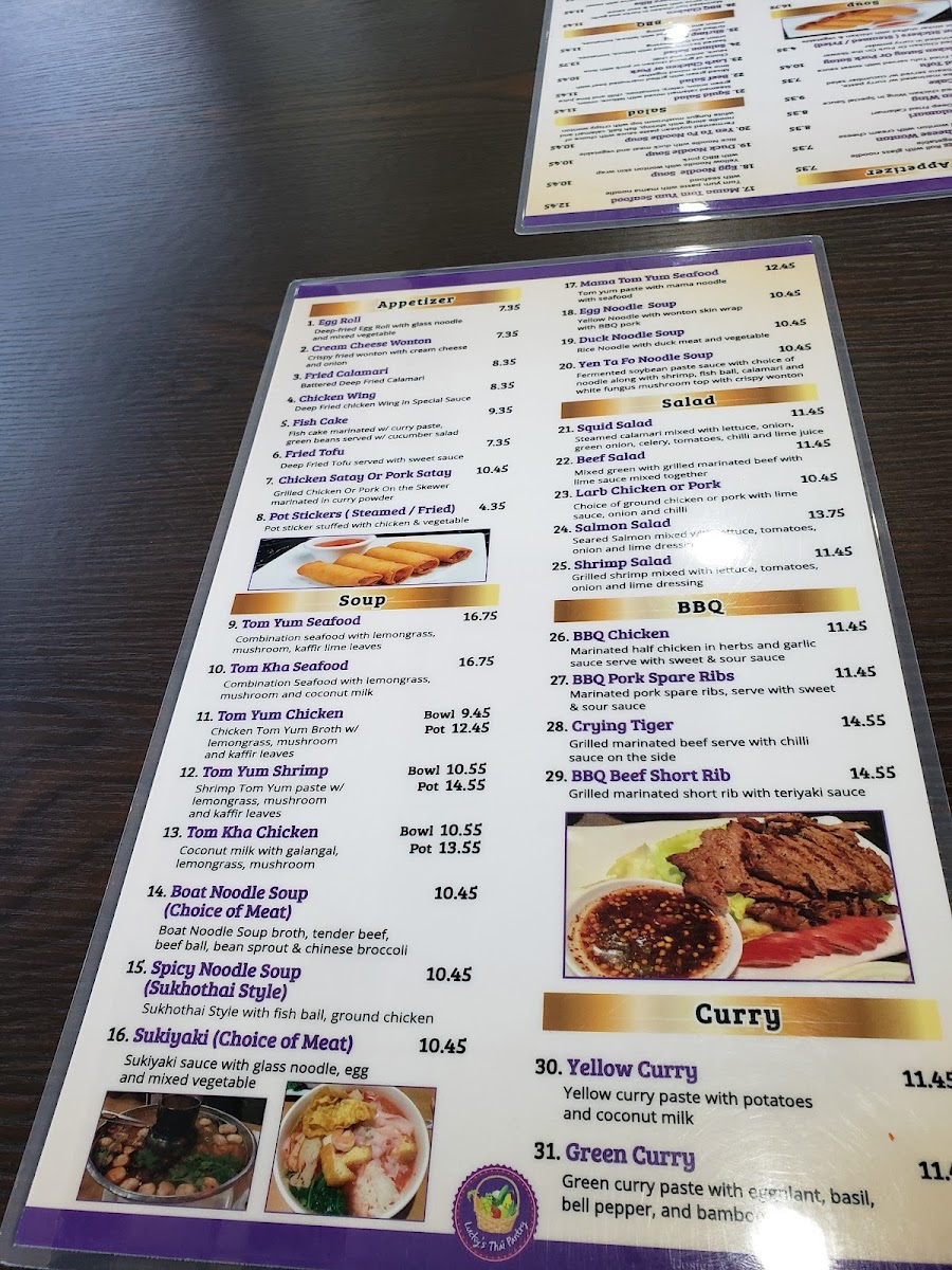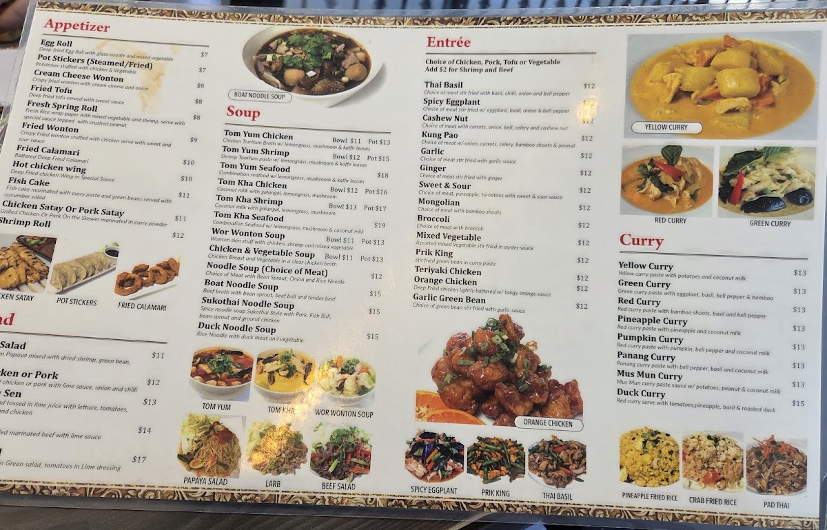 Guests often enjoy familiar flavors like Pad Thai and Yellow Curry during midday breaks, thanks to their hearty portions and approachable spice levels. Lighter options such as Fresh Spring Rolls or Tom Yum Soup make for welcome starters or lighter meals at any time. The menu also includes comforting, richly aromatic dishes like Green Curry Chicken and Laksa, which pair nicely with a refreshing Thai Iced Tea, ideal for cooling off in warm California weather.