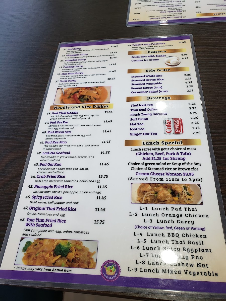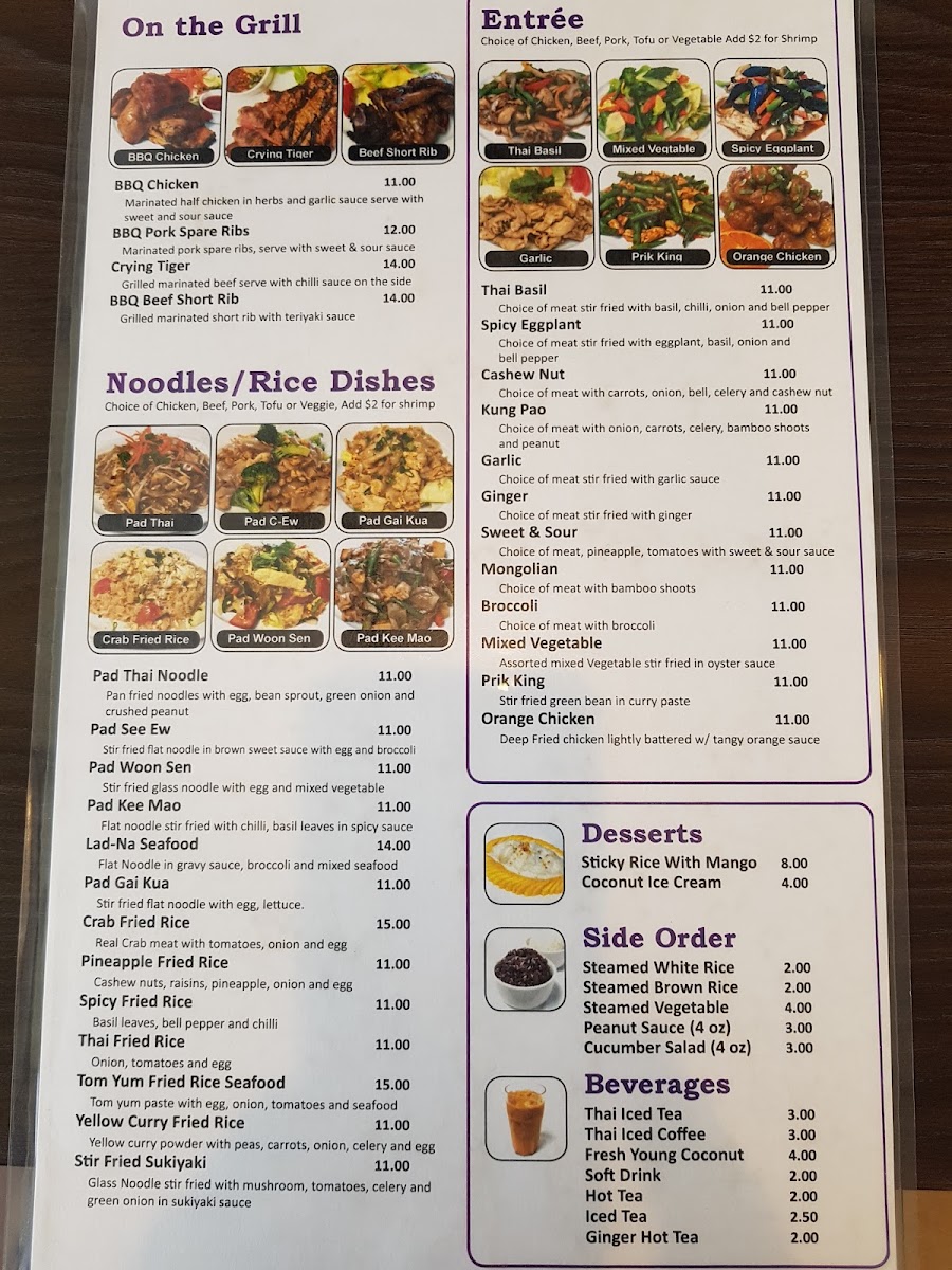 Whether you’re stopping by for a casual lunch special or ordering to-go, the dishes offer a sense of traditional Thai home cooking—fresh, flavorful, and thoughtfully prepared without being overly complex. The mix of crispy small bites like Cream Cheese Wontons and satay skewers complements the richer, saucier main plates, making the menu versatile and satisfying for different appetites.