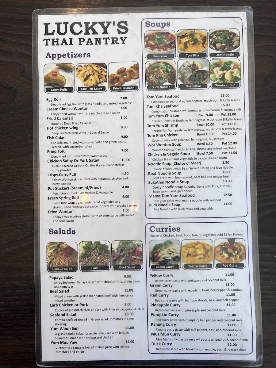 Lucky's Thai Pantry offers a straightforward and inviting menu, reflecting the casual and comforting atmosphere of this neighborhood Thai spot. The selection features a balance of well-loved classics alongside a few distinctive dishes, perfect for a satisfying lunch or a relaxed dinner.